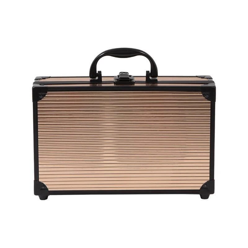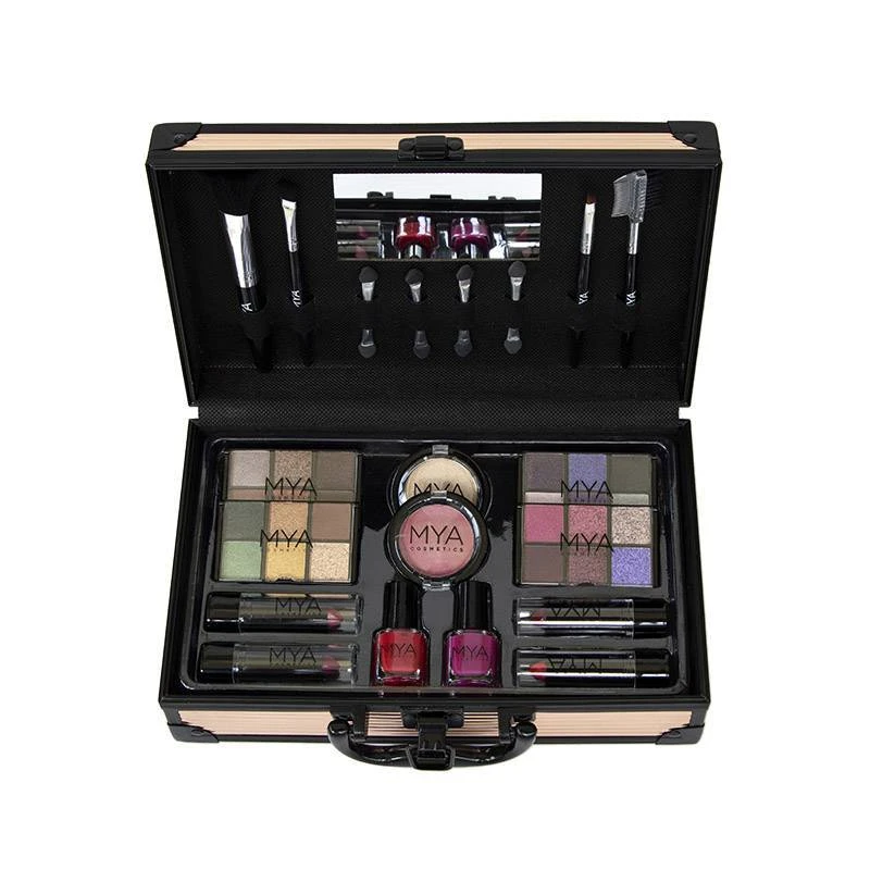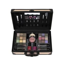 Maletín de maquillaje que contiene 24 sombras de ojos, 1 colorete, 1 polvo compacto, 4 barras de labios, 2 esmaltes de uñas, 4 aplicadores de esponja, 1 pincel de labios, 1 brocha de colorete, 1 cepillo para cejas y 1 espejo.
