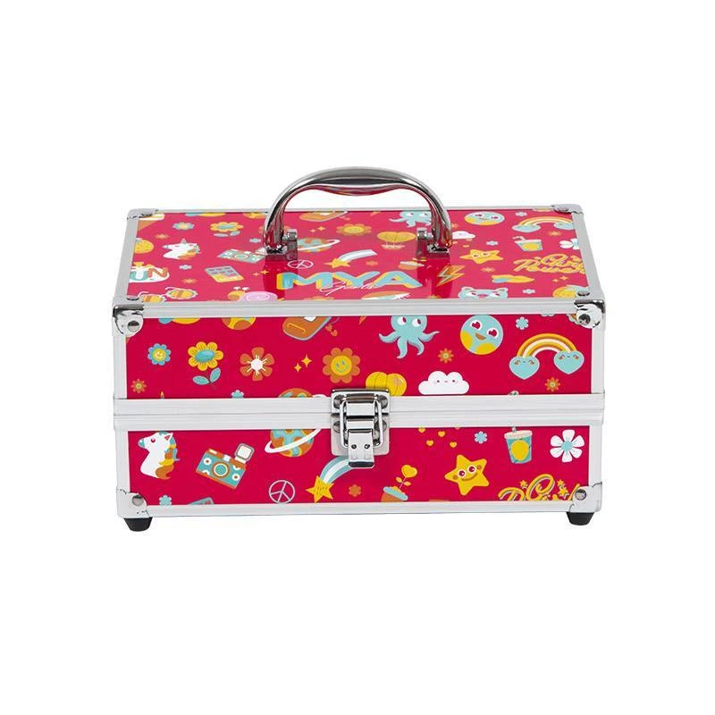 Este maletín incluye 11 brillos de labios, 11 sombras de ojos, 4 barras de labios, 4 coloretes, 1 anillo lipgloss, 3 esmaltes de uñas, 2 brochas para coloretes, 1 aplicador de esponja, 1 pincel de labios y 1 lima corazón.