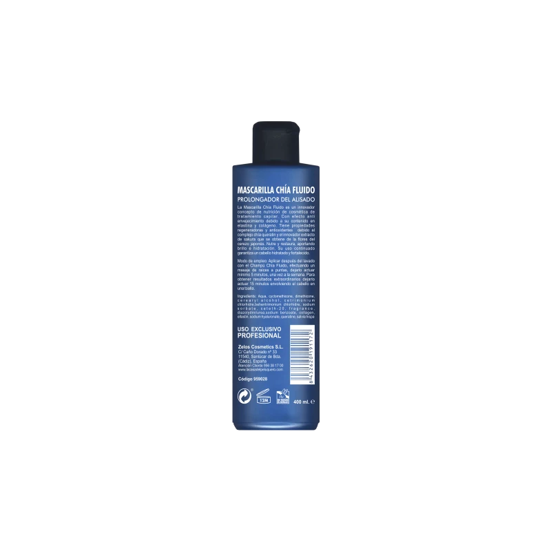 La Mascarilla Chía Prolongadora del Alisado con Omega complex con Chía, Elastina, Colágeno y Extracto de Sakura. La Mascarilla Chía Fluido es un innovador concepto de nutrición con efecto antienvejecimiento por su contenido en elastina y colágeno. Nutre y restaura, aportando brillo e hidratación. Su uso continuado garantiza un cabello fuerte e hidratado.
